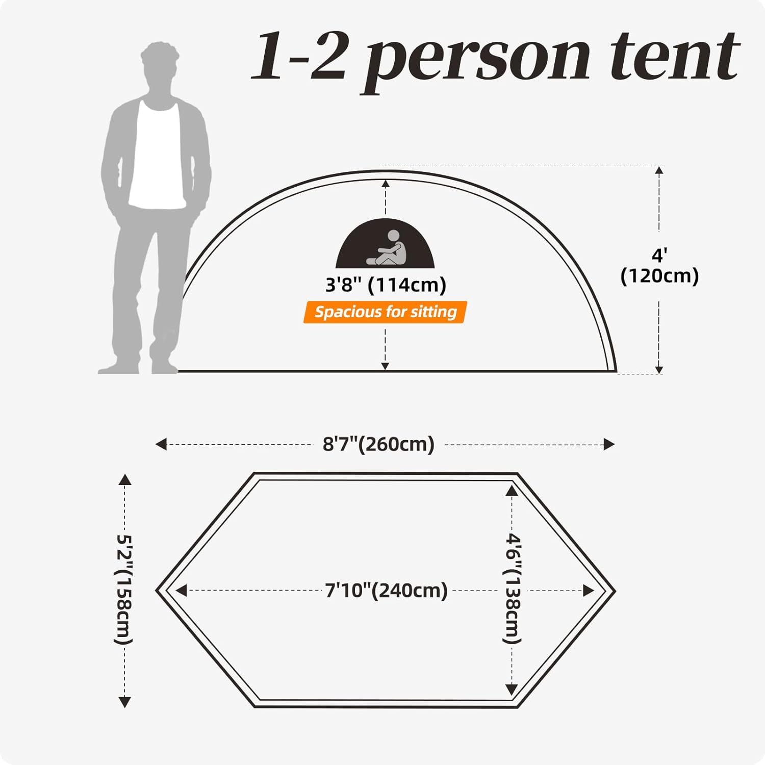 - Professional Largr 1 Person Tent Size: Inner tent(L95in x W54in x H45in), Outer tent: (L102in x W62in x H47in). This single person tent is long enough to enable the taller person to sleep in the tent comfortably; The longer tent also provides with extra space for the personal belongings like luggage, backpack, clothes, shoes, etc. It should be noted that trekking pole in the picture is not included in the tent set.