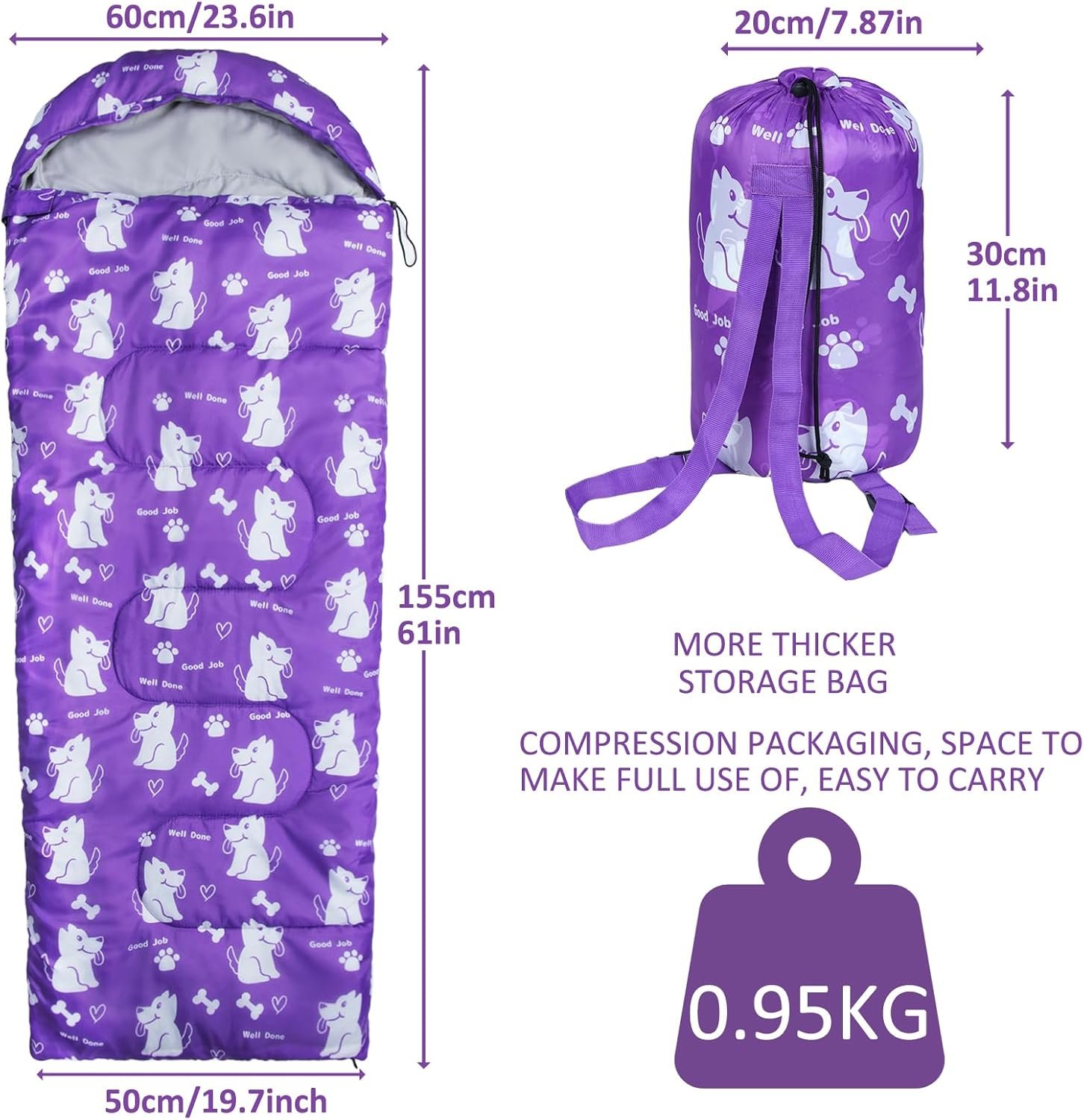 - Kids sleeping bag is designed with backpack style sack. Each sleeping bag comes with a compression sack with straps, allow you convenient carry and storage. Our sleeping bags have 2-way zipper which can fully open as a blanket and let your feet come out